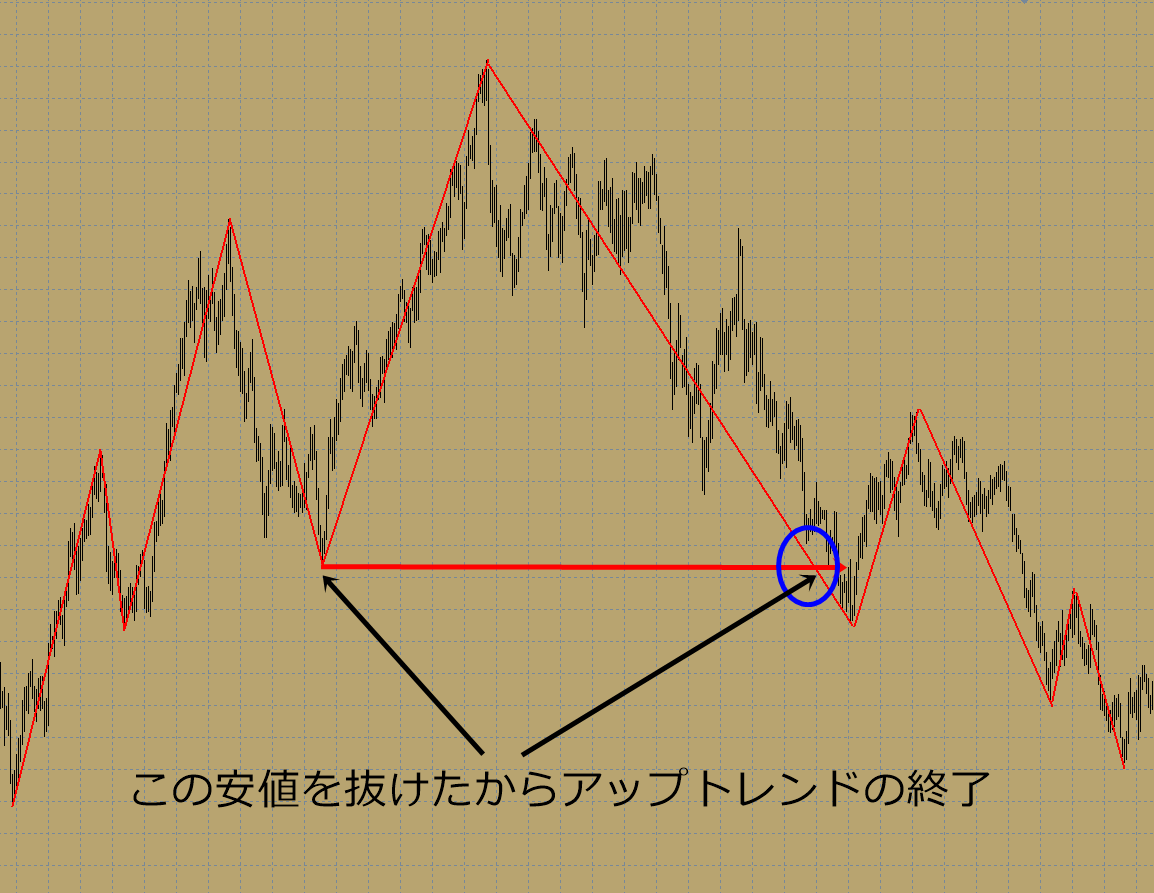 重要な安値、つまり、値幅の大きい戻り安値の底を抜けたとき、初めてダウ理論では「アップトレンドの終了」であると言っています。